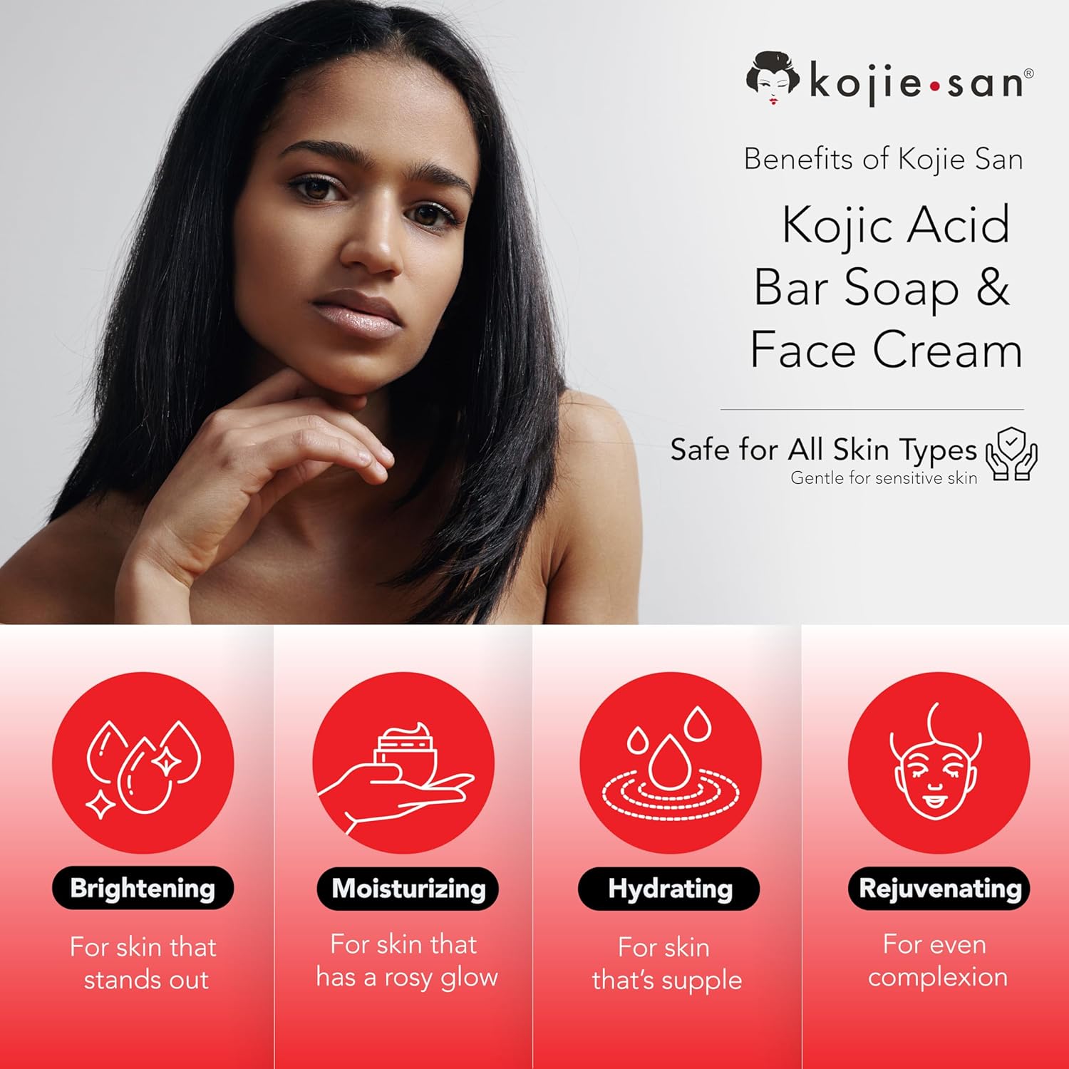 Kojie San Skincare Bundle - Facial Brightening Set with 2 Bars of Kojic Acid Soap, Face Cream & Exfoliating Face Brush