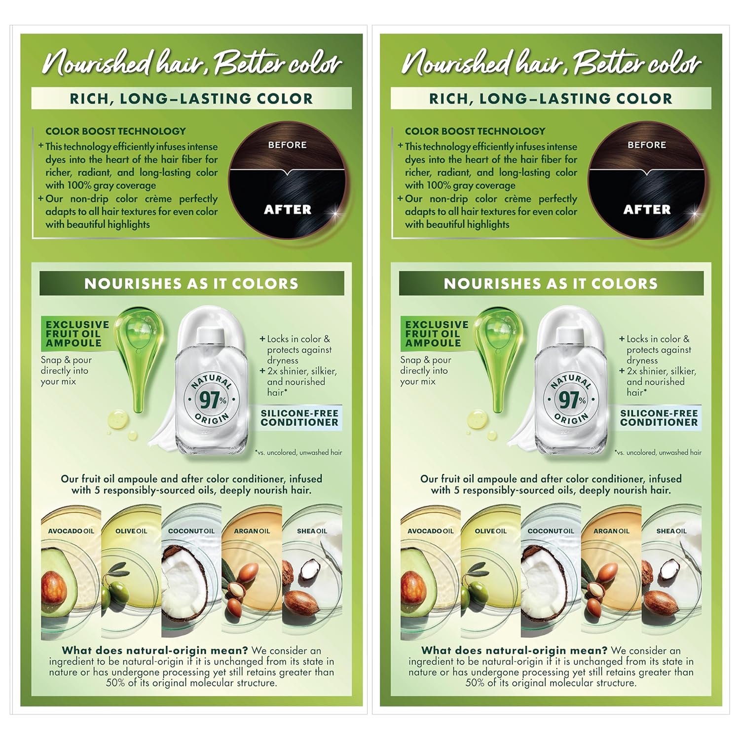 - Hair Dye Kit: The only hair color with a separate fruit oil ampoule that you snap & pour directly into the mix; Follow hair dye with our after color hair conditioner, infused with a blend of 5 fruit oils: avocado, olive, shea, argan & coconut oil