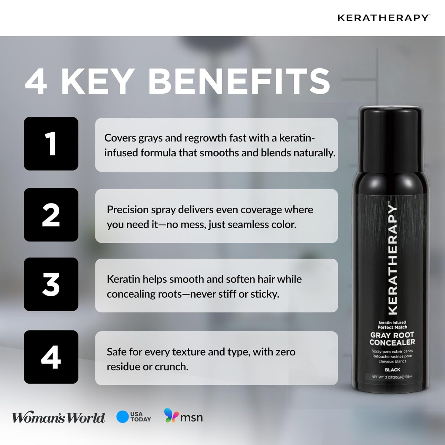 - Gray Root Coverage - Keratherapy Perfect Match Gray Root Concealer is specially formulated to temporarily cover gray roots in your hair with an easy spray-on application; This spray lasts until your next shampoo application