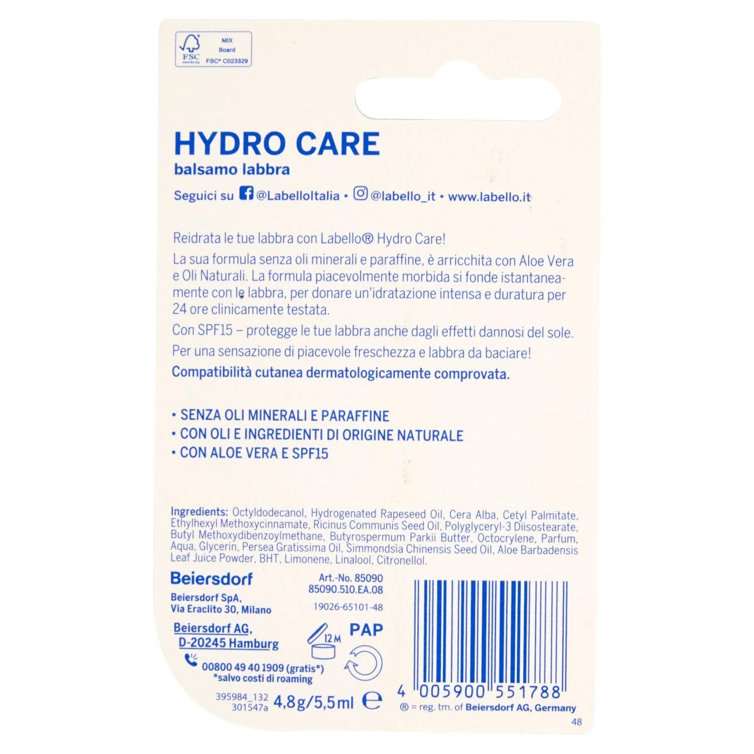 Labello Hydro Care Lip Balm With Natural Oils 5.5ml (0.18 Oz) [Italian Product]