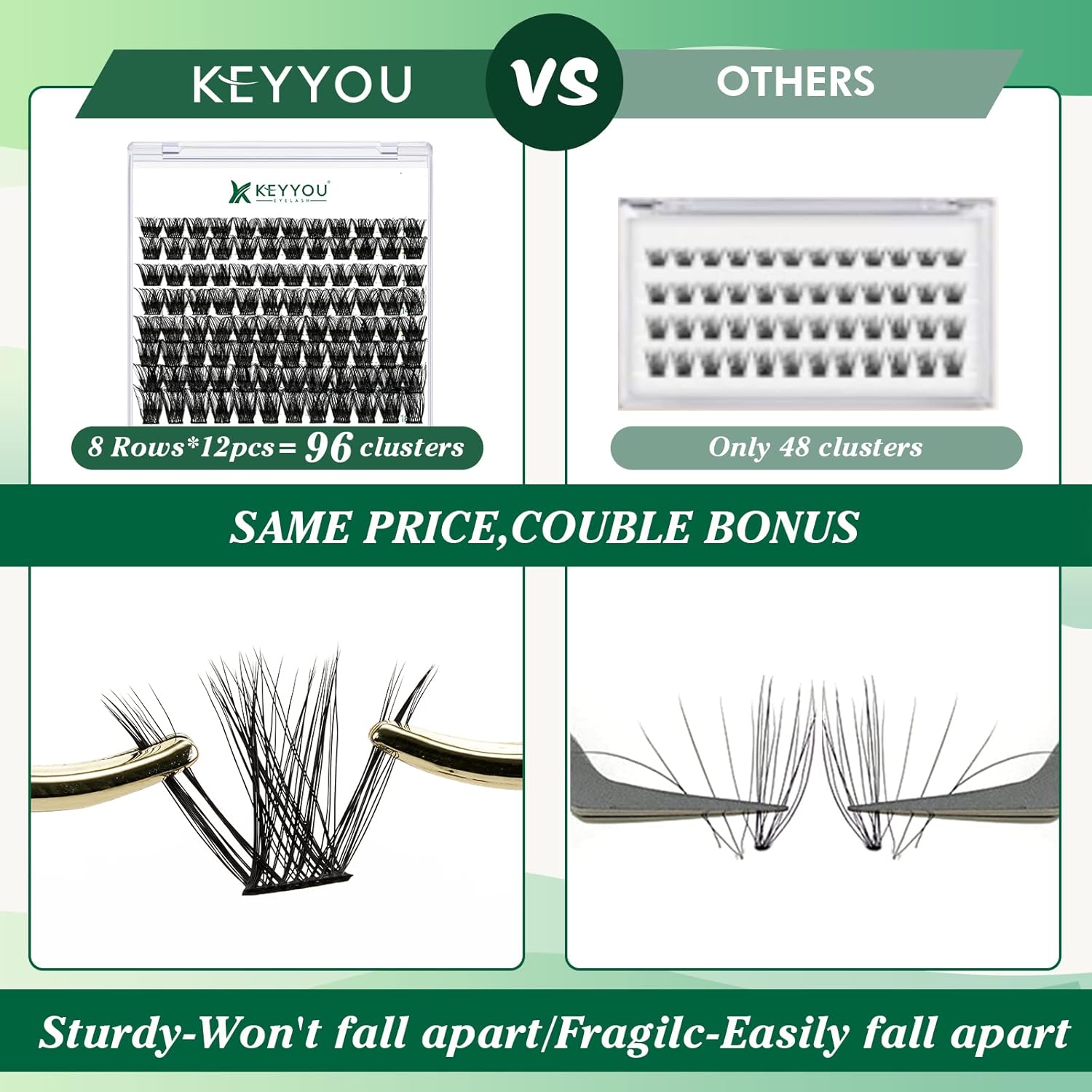- 【Soft&Comfortable】KEYYOU lash cluster are made of imported materials,the stem line is thinner and softer, the eyelash cluster are lighter and more comfortable to wear.96 clusters in one tray ,more cost-effective.