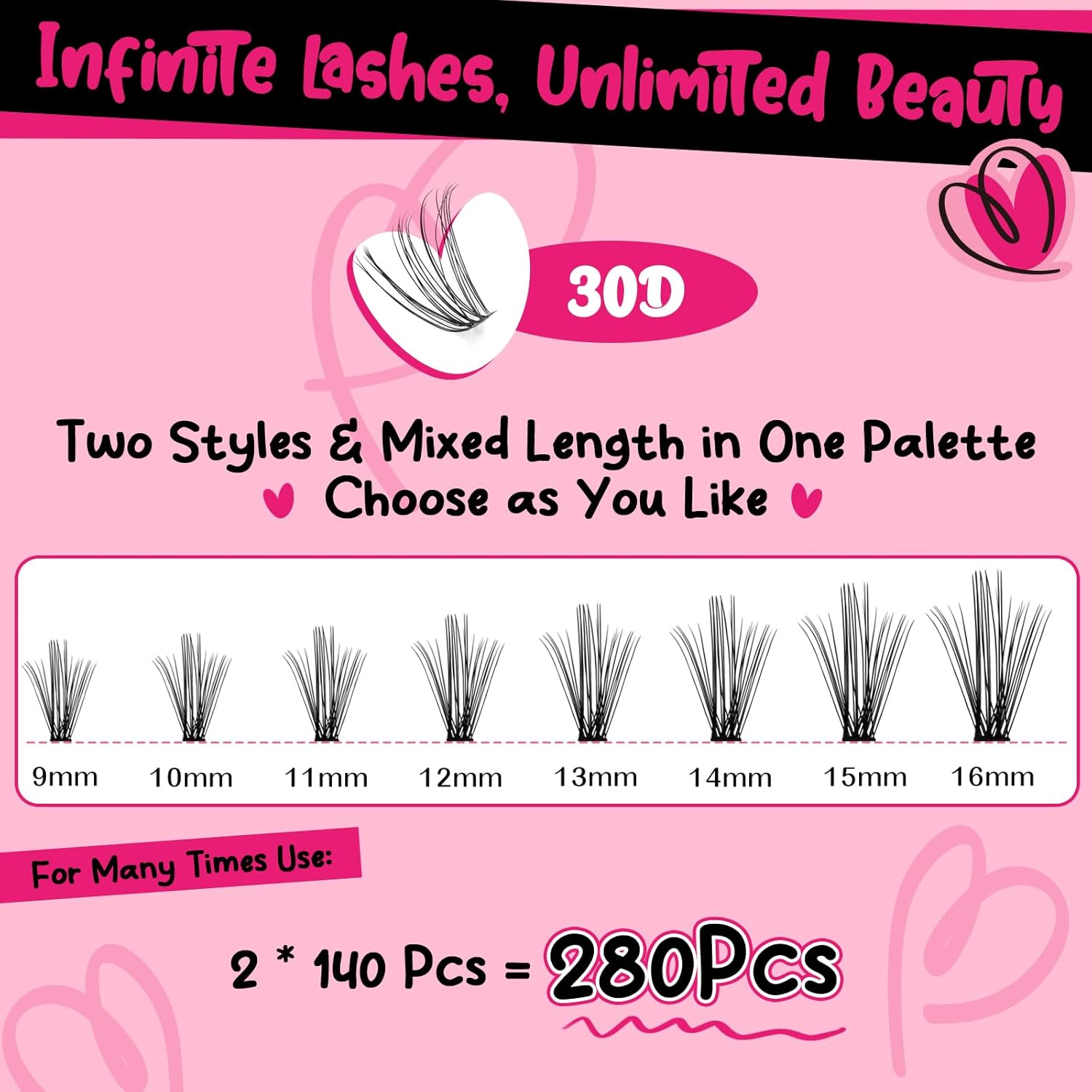 Lash Clusters Kit 280pcs Eyelash Clusters D Curl Eyelash Extension Kit Individual Lashes with Lash Bond and Seal Lash Remover Lash Applicator Easy to Apply at Home(50D-9-16mix Kit)