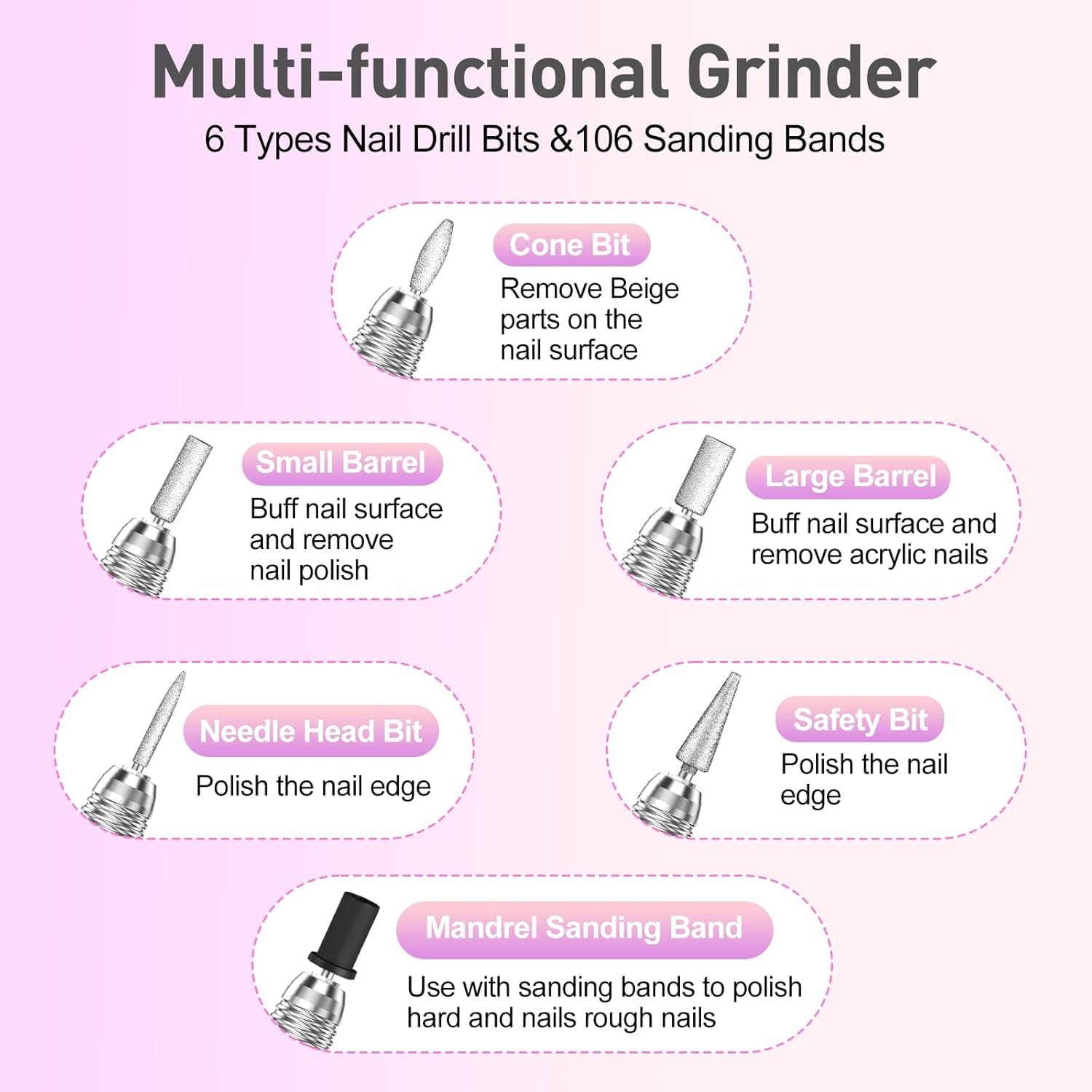 - Practical Acrylic Nail Kit: Electric nail file equipped with 6 nail drill bits and 100pcs sanding bands, meet all your demands for acrylic gel nails, dip powder nails and poly nail gels, works effective for polishing, shaping and removing