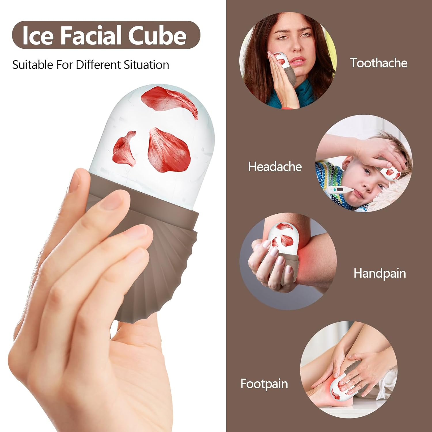 Ice Roller for Face and Eye, Silicone Ice Facial Roller Ice Holder, Face Ice Mold Skin Care, Face Icers Reusable Ice Cube Roller for Shrink Pores Anti Wrinkle Reduce Puffiness, Brown