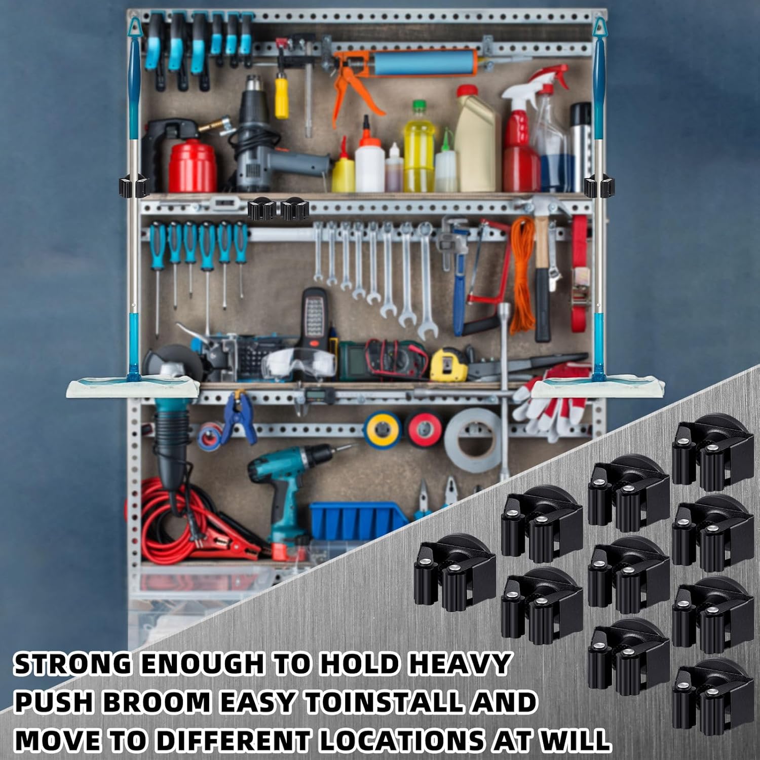 - Moveable Design: this broom and mop holder feature a moveable design, offering the flexibility to adjust the arrangement to suit your preference or needs; Enjoy the convenience of customizing your space and keeping your cleaning tools exactly where you want them