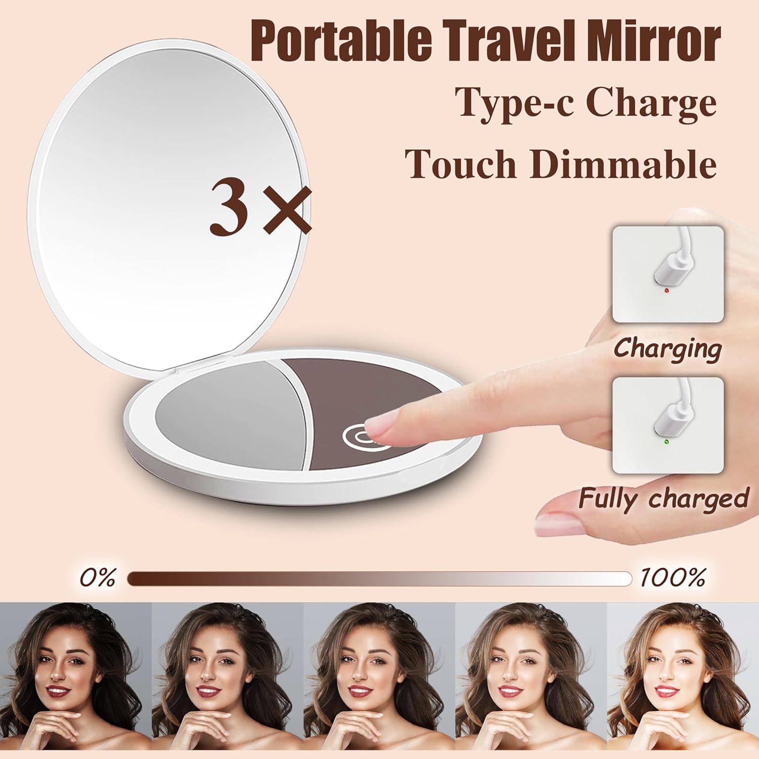 - 【Travel Mirror with Lights 】Dimmable mini mirror with 3.5" diameter. Long-lasting, if used for 20 minutes a day, a full charge can last for a week, only takes 1.5-2 hours to fully charge.