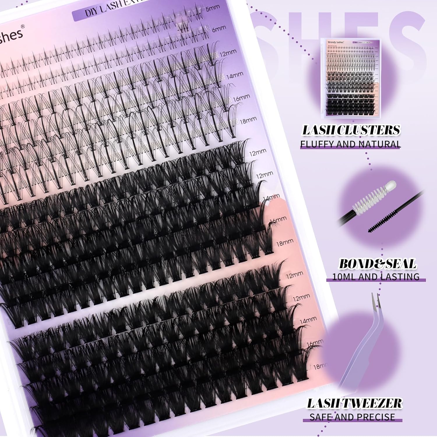 - DIFFERENT STYLES OF COMBO TRAYS: Our lash cluster kits come with four different styles of lashes, whether you want natural or thick, fox eyes or doll eyes, with a mix of lengths ranging from 12-18mm to meet any of your needs.