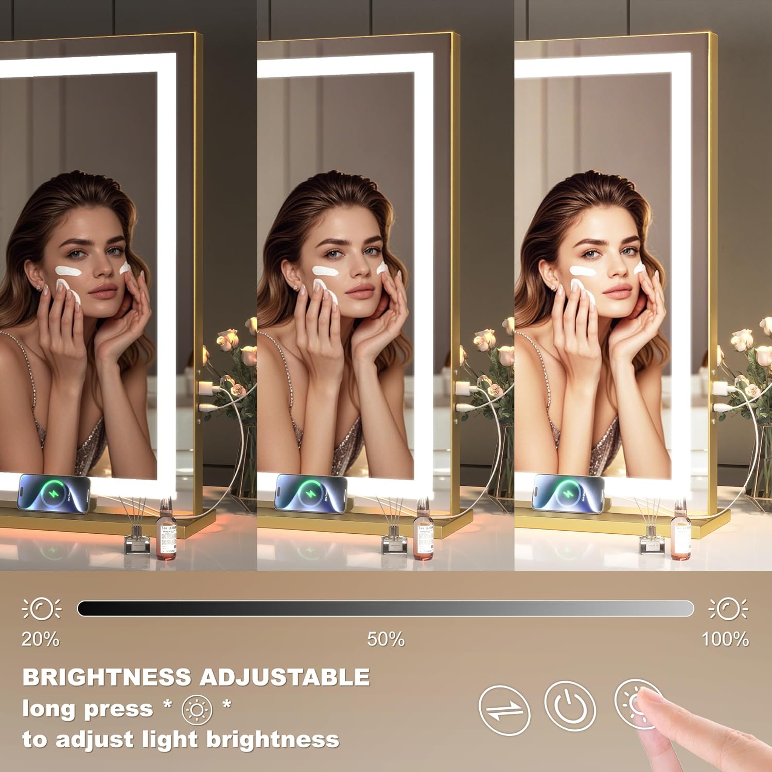 - 👍【Brightness Adjustable and 3 Color Lighting Modes】HASIPU lighted makeup mirror surrounded by 50,000 hours life Max 6000 Lumens high brightness LED Light Strip, with warm /natural /cold white three-tone settings, adjustable brightness 0%-100% can meet your personal makeup requirement.