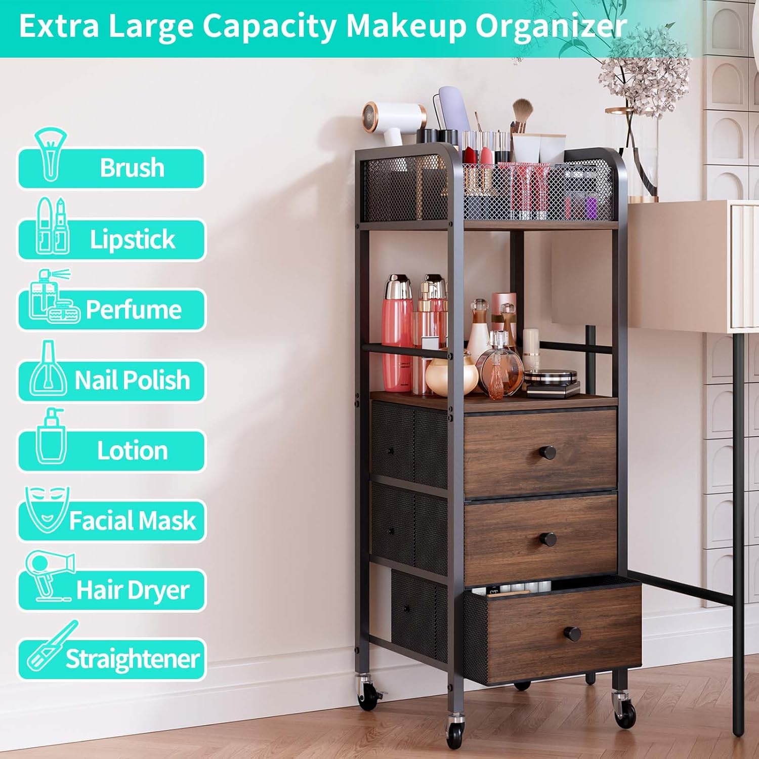 - [Large Capacity & Classified Storage]: This makeup organizer with drawers is designed with 5 independent sections. The top skincare organizers of this anity organizer has 9 compartments for makeup brushes, combs, hairdryers, straighteners, commonly used lipsticks, perfumes, and nail polishes; 3 large vanity organizer drawers for sunglasses, hair accessories, jewelry, watches and storing a large number of creams, masks, cotton pads, contour palettes; a middle open shelf for full-size facial cleansers, toners, lotions, makeup removers