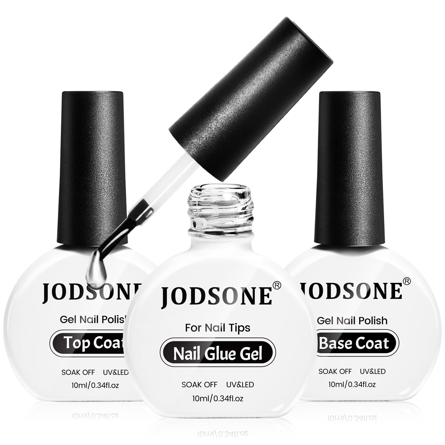 - What You Will Receive: JODSONE 3Pcs 10ml Top Coat, Base Coat, and Nail Glue Gel Set. The nail glue gel provides strong adhesion for nail tips and decorations, the base coat protects your natural nails, and the top coat delivers a high-gloss, long-lasting finish.