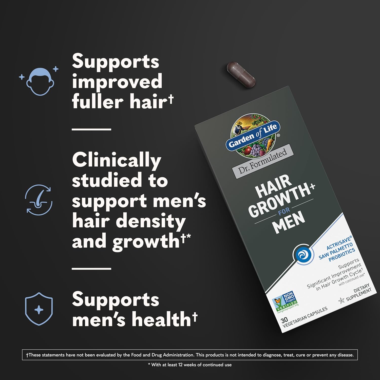 Garden of Life Dr. Formulated Hair Growth for Men with Clinically Studied Extracts and Saw Palmetto for Men to Support Men’s Hair Growth, 30 Count Vegetarian Capsules