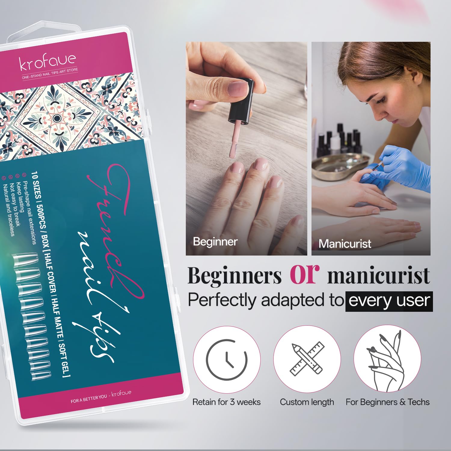 - HALF MATTE & HALF COVER DESIGN:These acrylic nail tips feature a special half matte surface for superior adhesion. The half cover nail tips design adheres better to the nail and looks more natural. Half matte french nails perfect for most beginners and professionals!