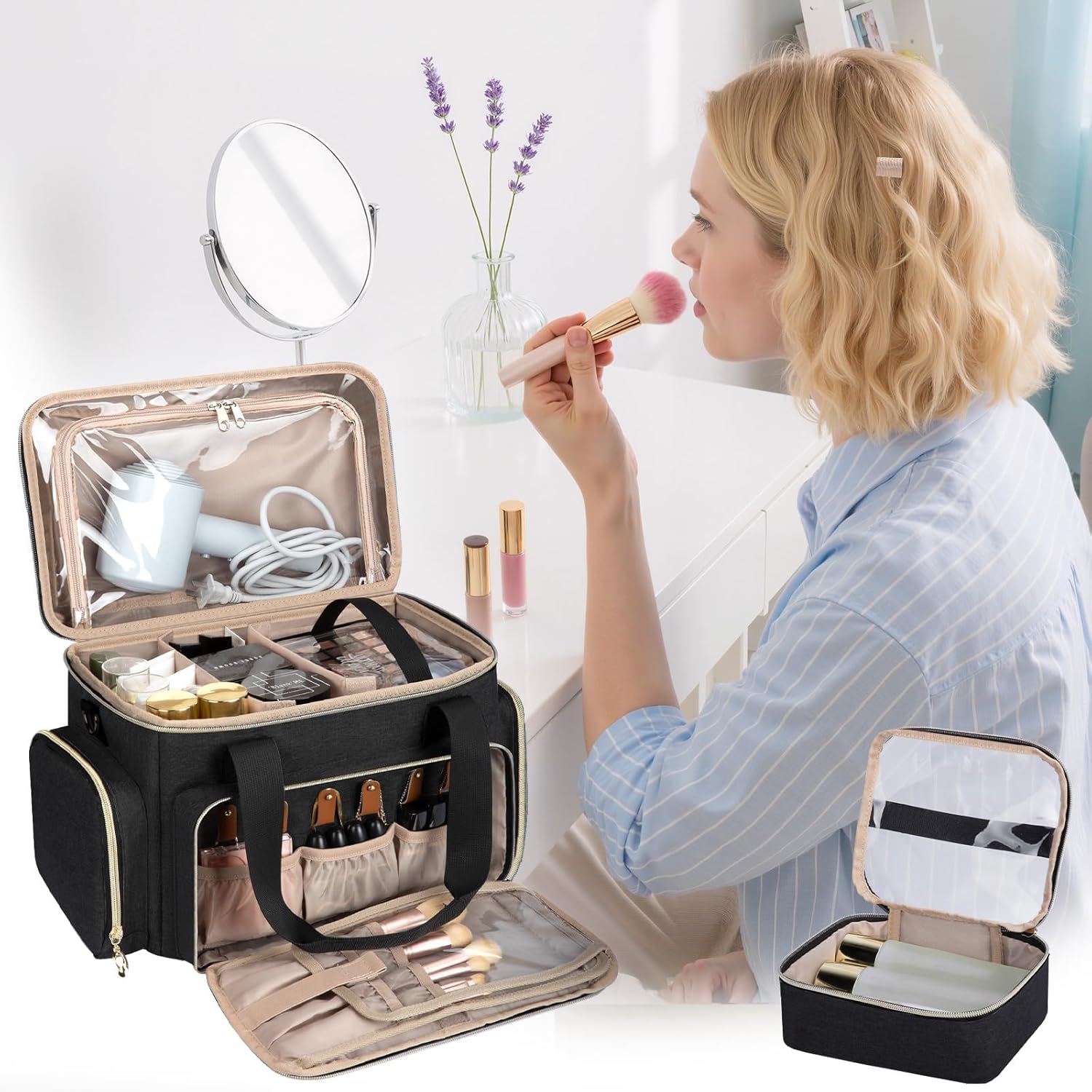 - Well-organized Compartments: The main compartment has two flexible, removable dividers that can store cosmetics of various sizes. The main compartment has 2 inner small pockets and 2 clear toiletries pouches for neatly storing your cosmetics and travel toiletries. The spacious transparent pocket at the top can hold small hair straighteners and other hair care products