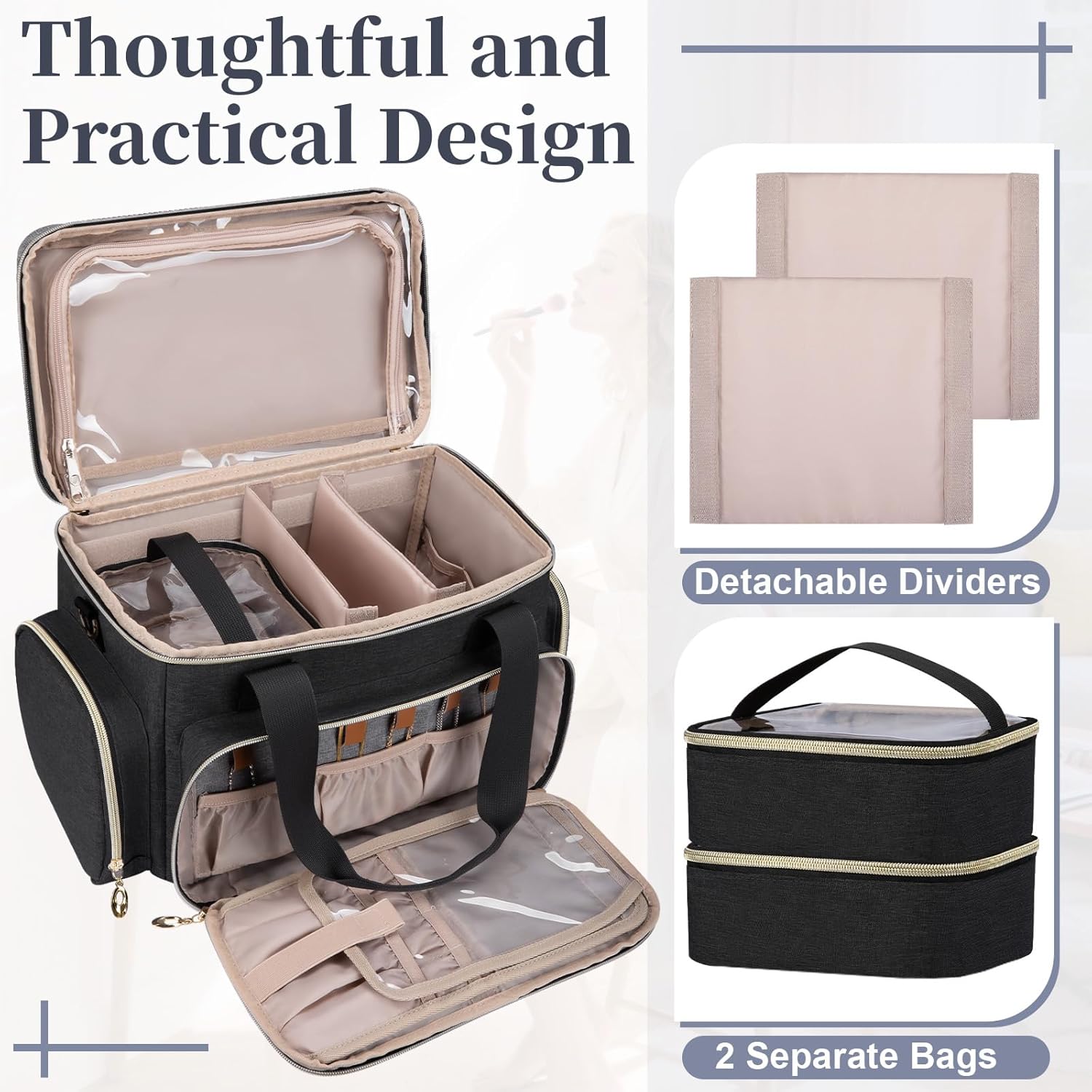 Large Makeup Bag, Portable Travel Makeup Bag Organizer for Women Girls with 2 Removable Pouches & Detachable Dividers, Cosmetic Travel Bag, Toiletry Bag for Makeup and Hair Supplies Black
